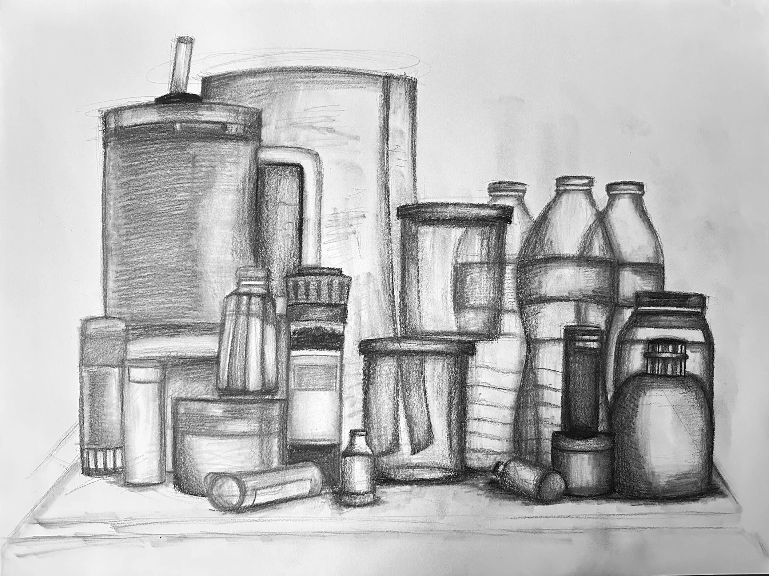 An observational drawing of a still life of various cylinder shapes found in my dorm room. A still life drawing is a “depiction of non-living objects that are arranged in a specific way to create a visual effect or meaning”.