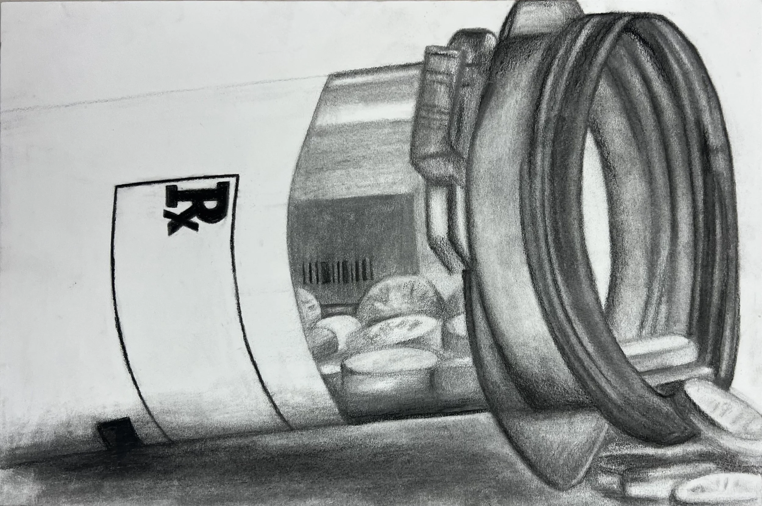 An observational drawing of a pill bottle that was drawn with charcoal pencil. This piece was submitted in my AP Art Portfolio in 2022.