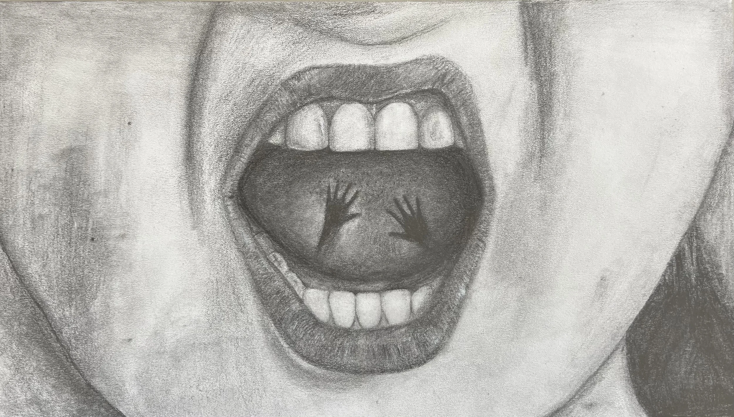 A self-portrait drawing depicting the struggles of speaking up, and leaving unsaid words “trapped” in one’s mouth. This piece was submitted in my AP Art Portfolio in 2022.
