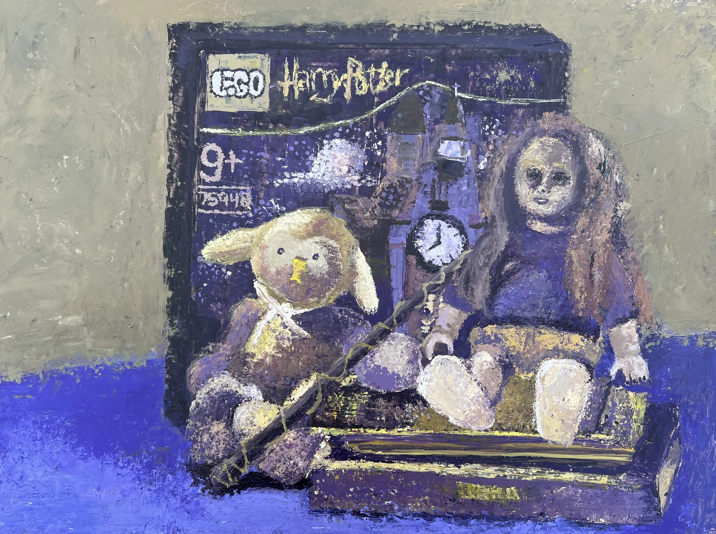 An observational still-life painting of my favorite childhood toys including my stuffed animal, Sheepy, Legos, a wand, an American Girl Doll, and comic books. The challenge was to only use two complementary colors, I chose purple and yellow, to create different values and depth. This entire painting was created using only a singular 2x6 Lego piece.