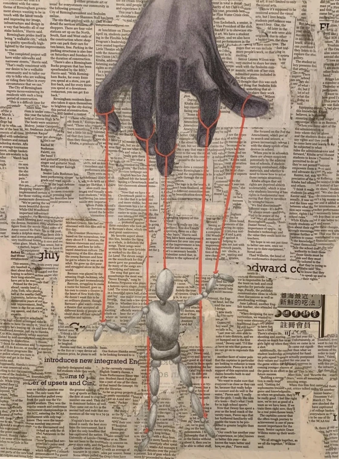 A collage of newspapers, paint markers, and graphite drawings symbolizing one feeling controlled by another, and often feeling lost. The drawings were both done by observation. This piece was submitted in my AP Art Portfolio in 2022.