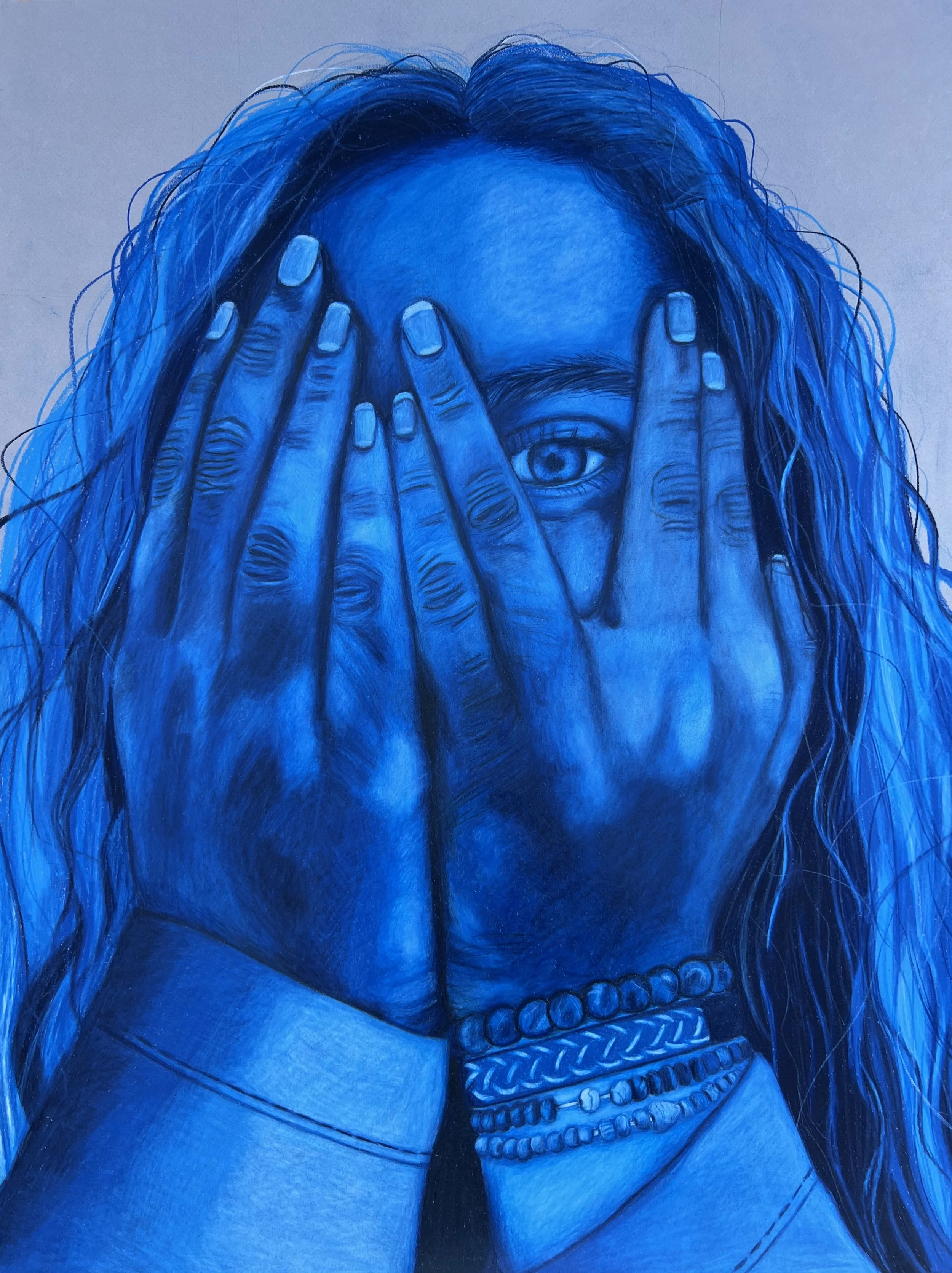 A self-portrait colored pencil drawing done over the span of 6 months. This was my first time experimenting with a one color palette - I used only 2 shades of blue along with white. This is my favorite work to this day.