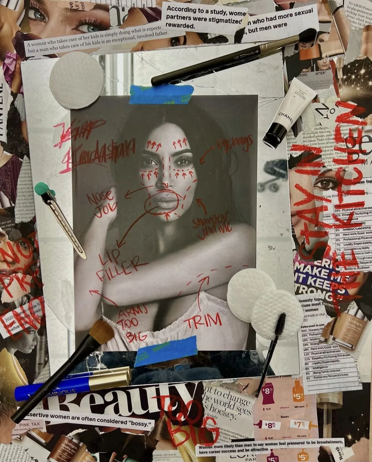A mixed-media collage of various beauty items, statistics, magazines, and red crayon symbolizing how beauty standards often make women feel like they have to look a certain way. I utilized the red crayon to mimic surgical plans and areas to change and well as statistics and quotes from maganizes regarding the issue in society.